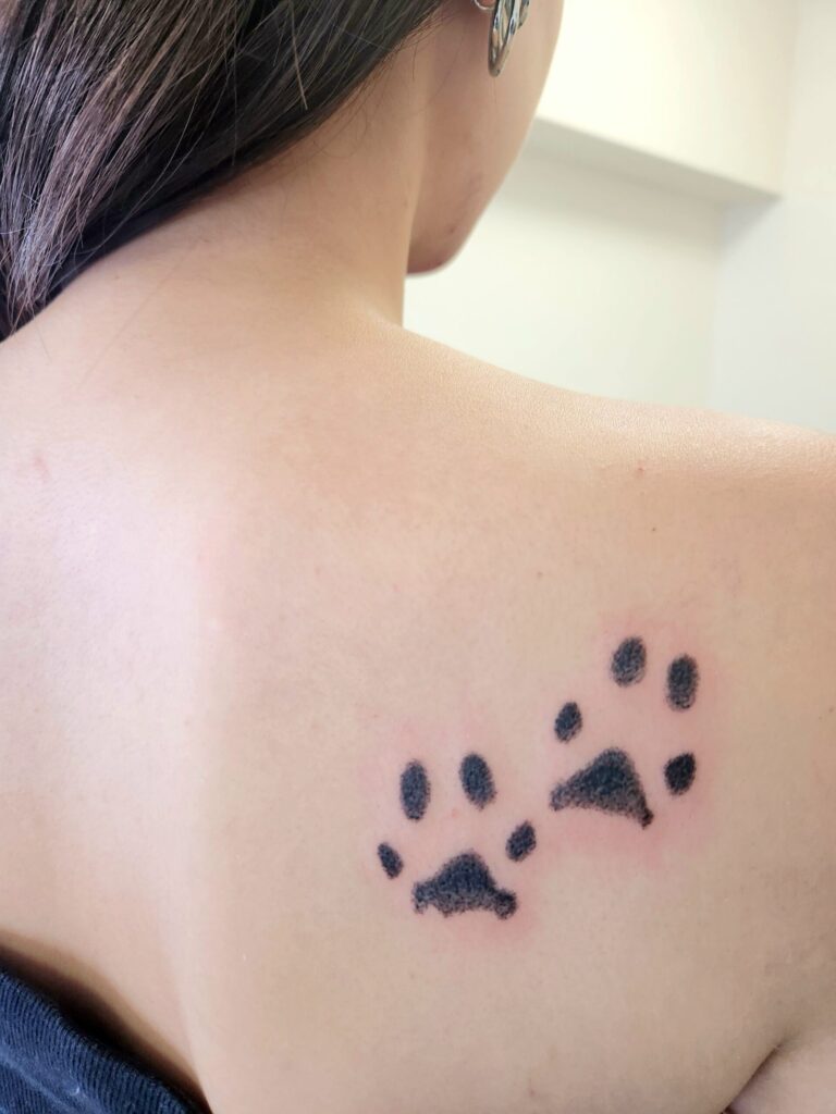 ファーストタトゥーのお客様。 ずっと一緒に育った愛犬の肉球を肩甲骨に。 就活で上京し、なかなか会えない日々でも、 心と肌でいつも繋がっていますね♪
