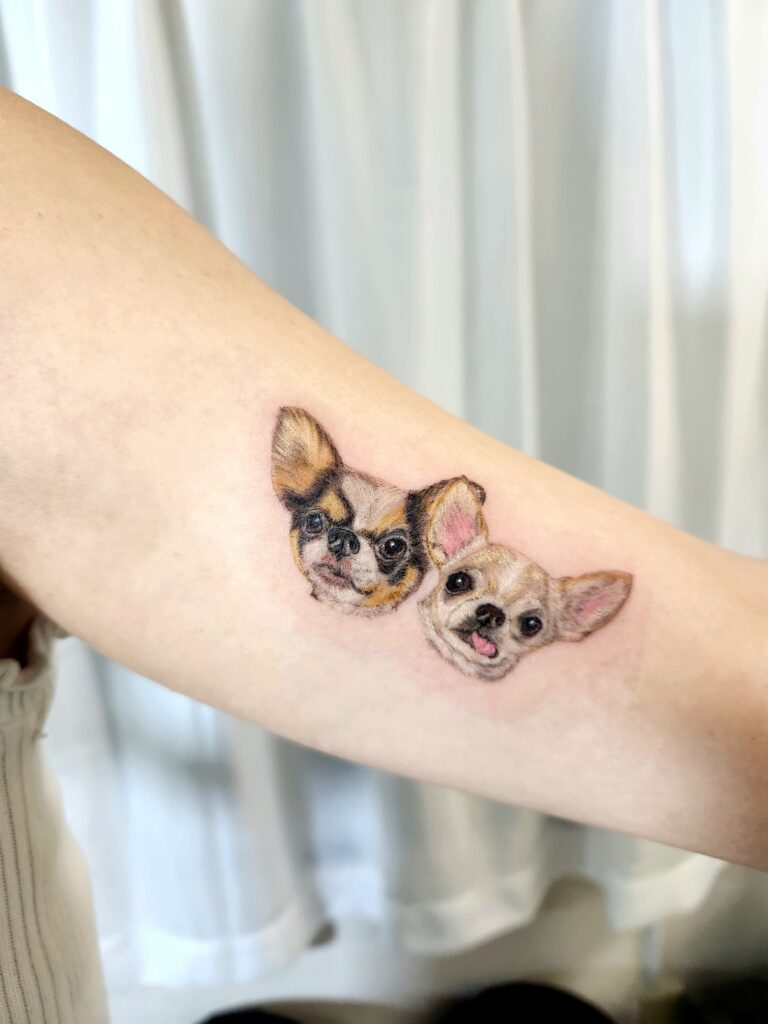 1匹ずつ別々のお写真から寄り添うように配置し、二の腕の内側に施術させていただきました。この位置だと飼い主さまと愛犬ちゃんの目が合うため、大変喜んでいただけます♪