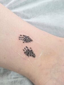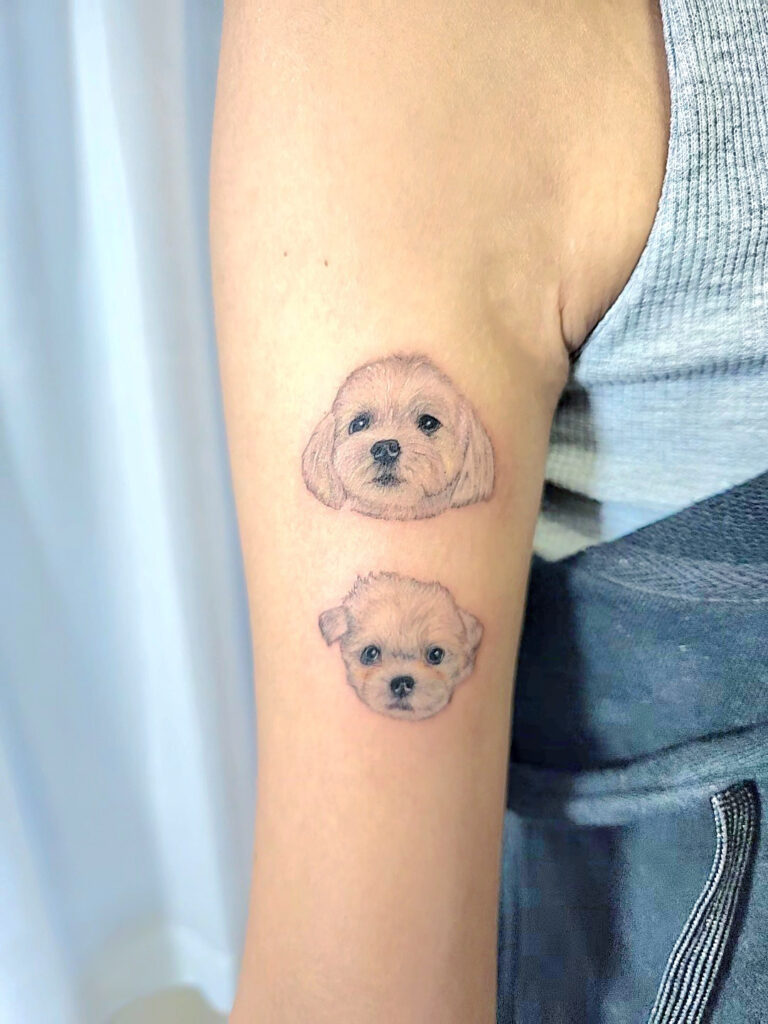 2歳と4ヶ月のマルチーズ親子ちゃんを、二の腕に縦並びで施術いたしました。ホワイトタトゥーベースですが、薄いグレーを忍ばせて立体的に仕上げています♪